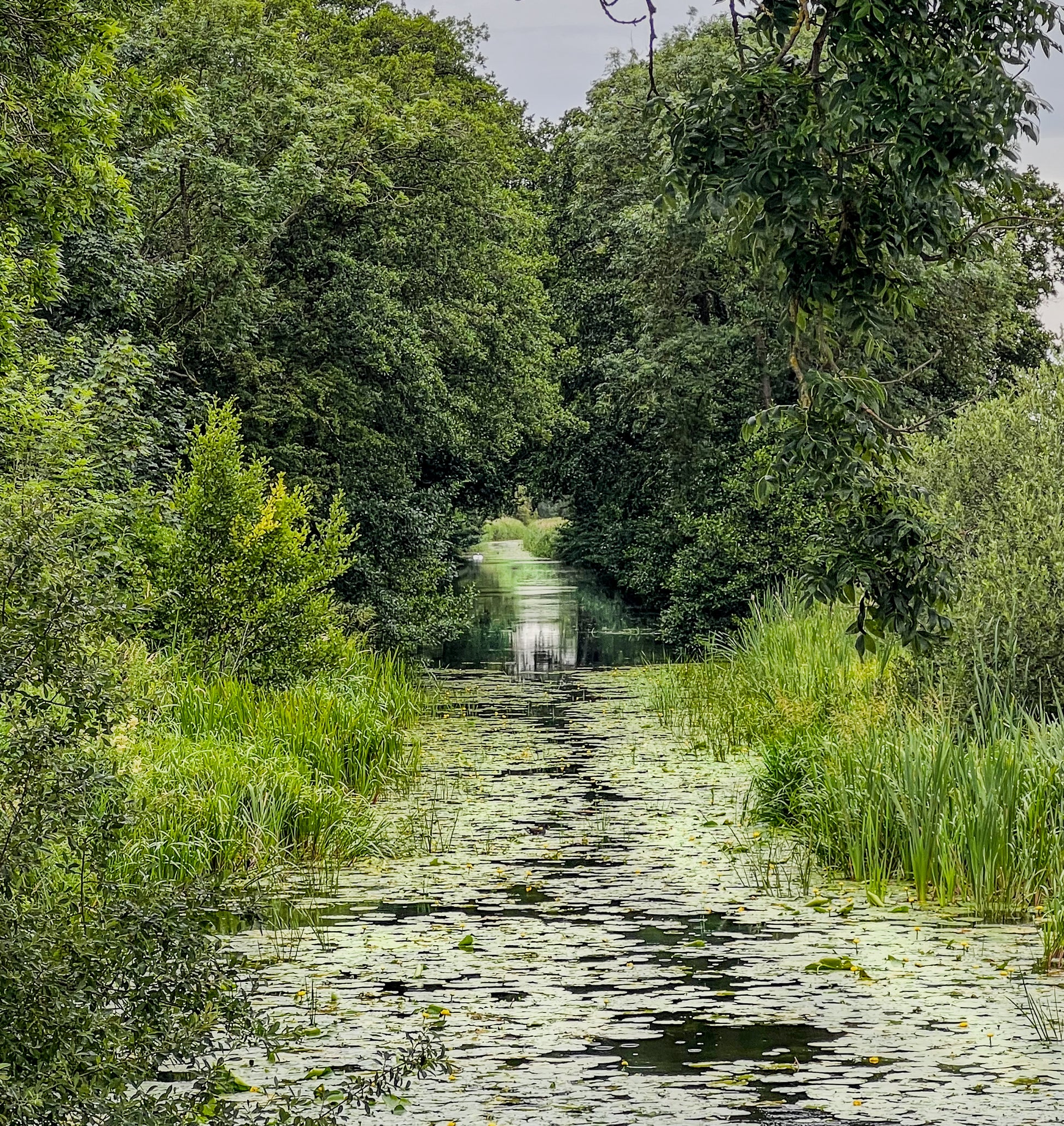 This serene landscape captures a lush, tree-lined section of the navigable Pocklington Canal on a sultry, humid afternoon in June. The water, dotted with lily pads, draws your eye into the depths of nature's calm, framed perfectly by overhanging branches and vibrant summer foliage. A peaceful and immersive scene ideal for any nature lover’s space.
